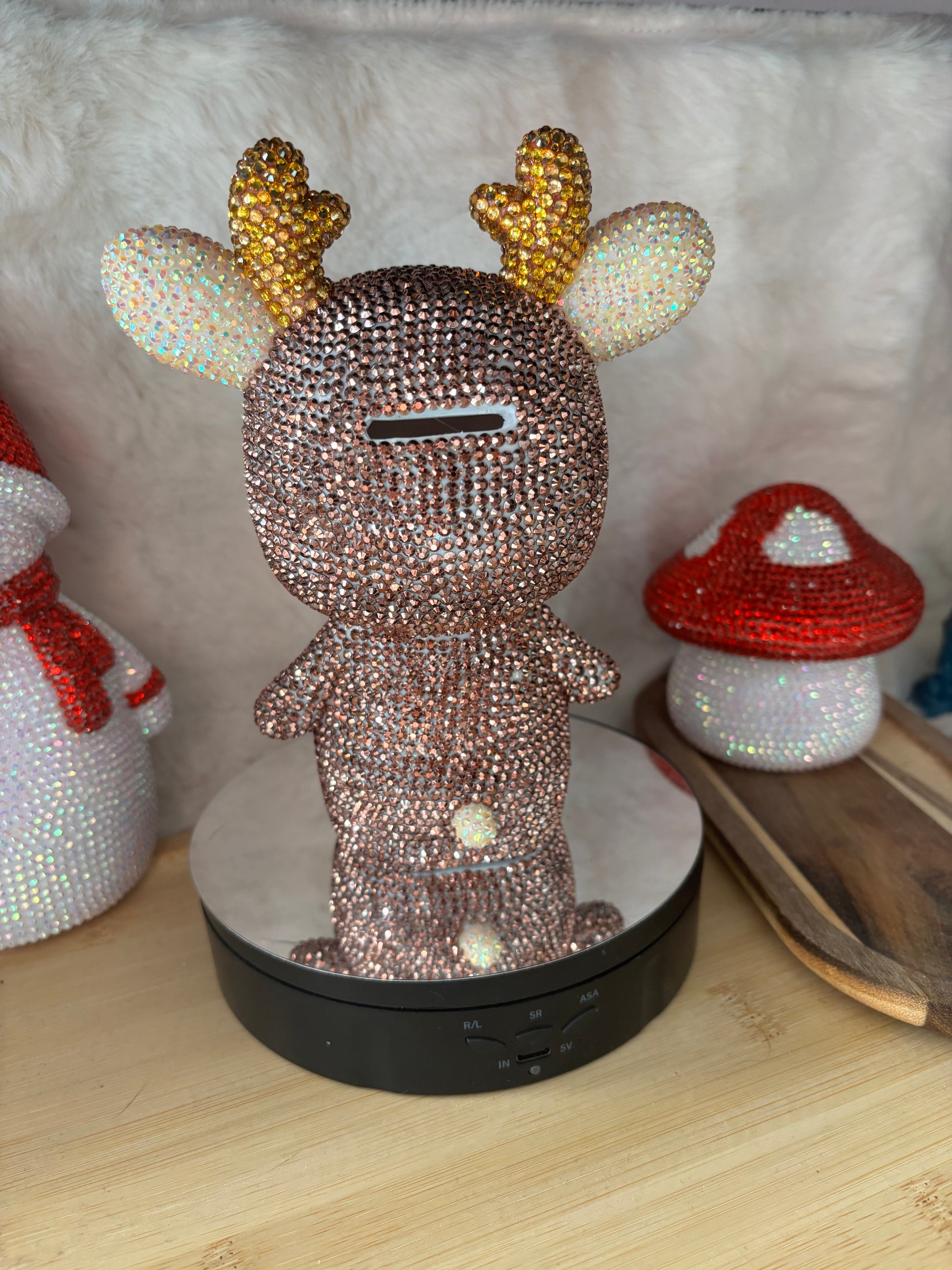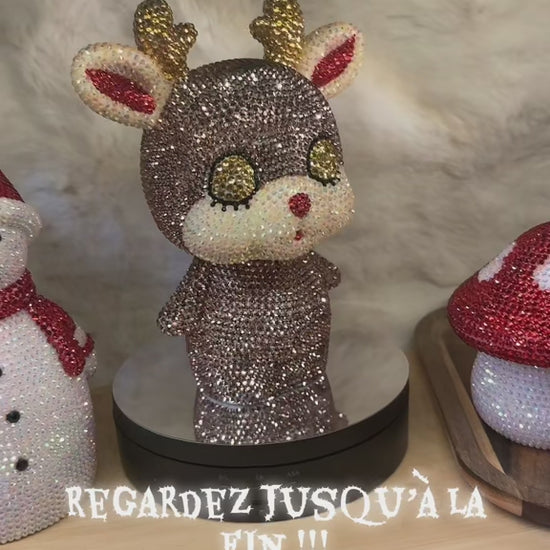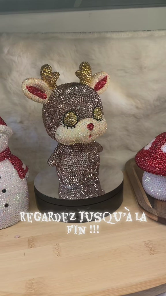 C’est un renne entièrement strasser à la main qui peut servir de tirelire ou de veilleuse